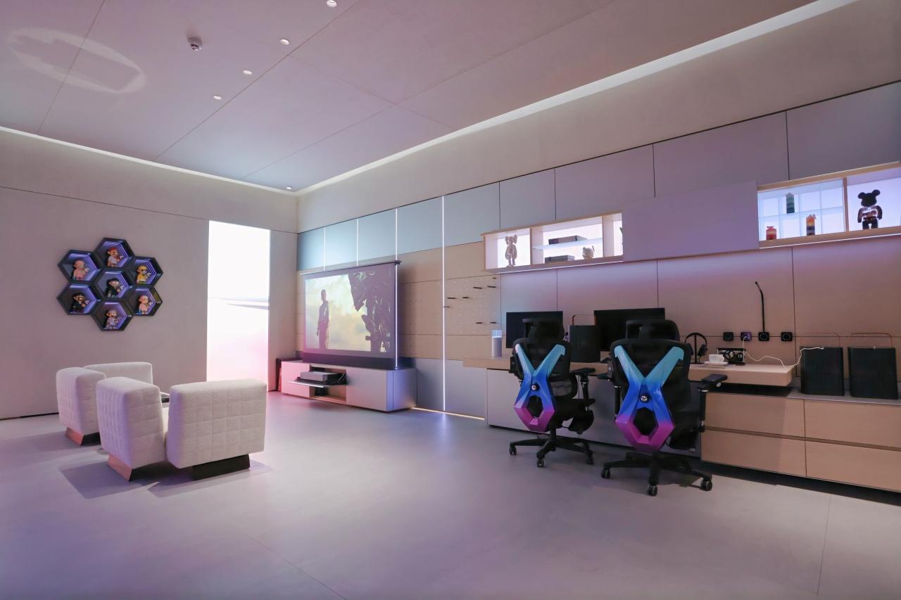 兴趣空间 | 次元宇宙的声光结界。这里是对Z世代多元热爱的高光致敬,电竞、观影、手办、运动等全部容纳其中。立体灯光设计可组合N种情绪方案:骏逸模式下挑马术装备清晰可见;霆决模式下电竞区光影跃动,潮玩柜同步点亮。激光投影与幕布从柜内缓缓升起,“能量补给站”冰饮随手可取。洞洞板单孔承重20kg,健身器材轻松悬挂;多巴胺背板随音乐律动,深渊镜线条灯光让潮玩成为空间主角——这里是年轻人的声光结界,让思绪一键放空。